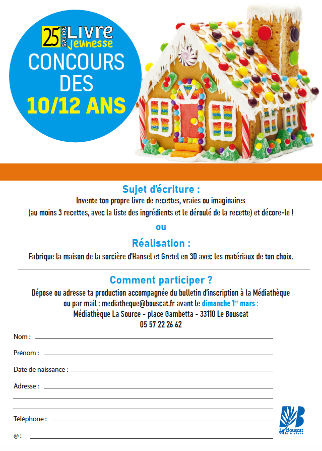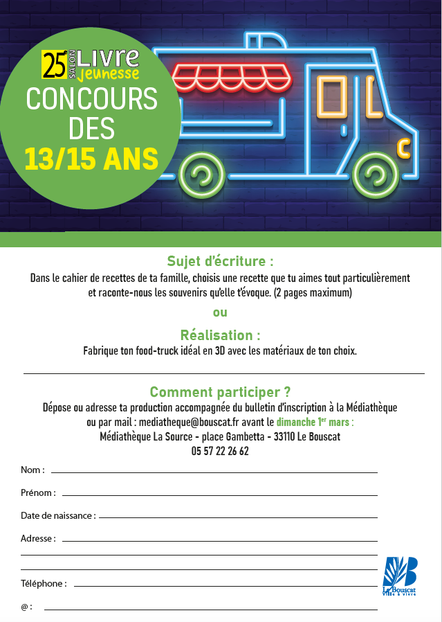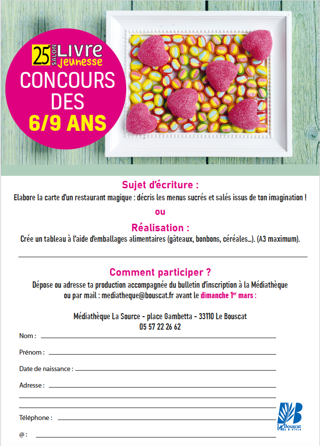 Comment participer ? Dépose ou adresse ta production accompagnée du bulletin d’inscription à la Médiathèque Municipale du Bouscat avant le dimanche 01 mars : La Source – place Gambetta – 33110 Le Bouscat mediatheque@bouscat.fr– 05 57 22 27 62 – Site internet : salondulivrejeunesse-bouscat.fr